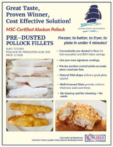 Pollock, Fillet, Pre-dusted Conveniently pre-dusted in flour for fast execution and Back of House labor savings. Freezer, to batter, to fryer, to plate in under 4 minutes! Read more »